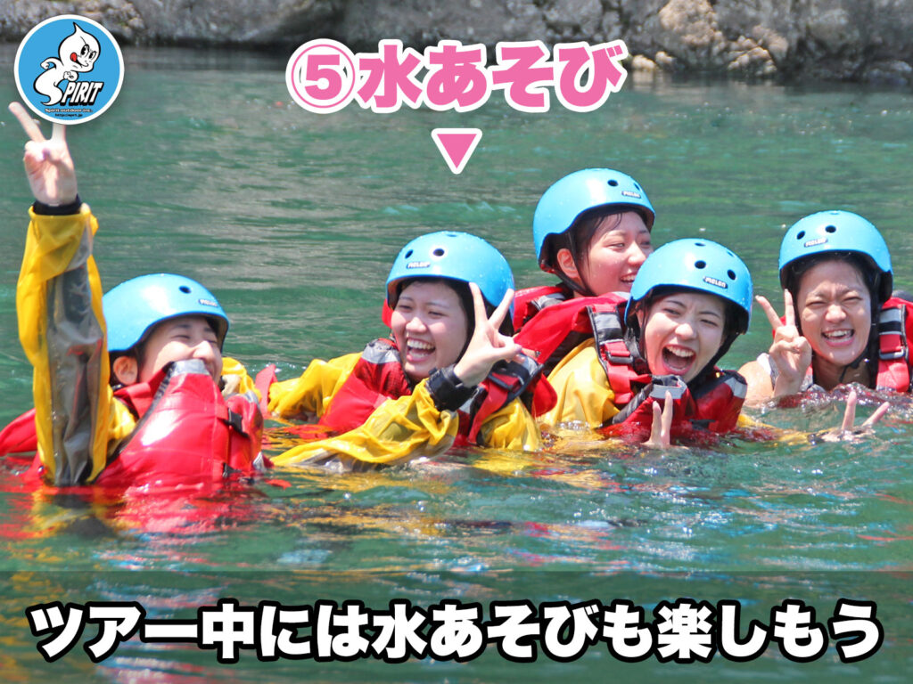 ライフジャケットでぷかぷか浮くのを楽しむこともできます。ガイドの安全管理のもと安心して水遊びを満喫できます。